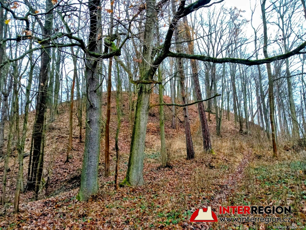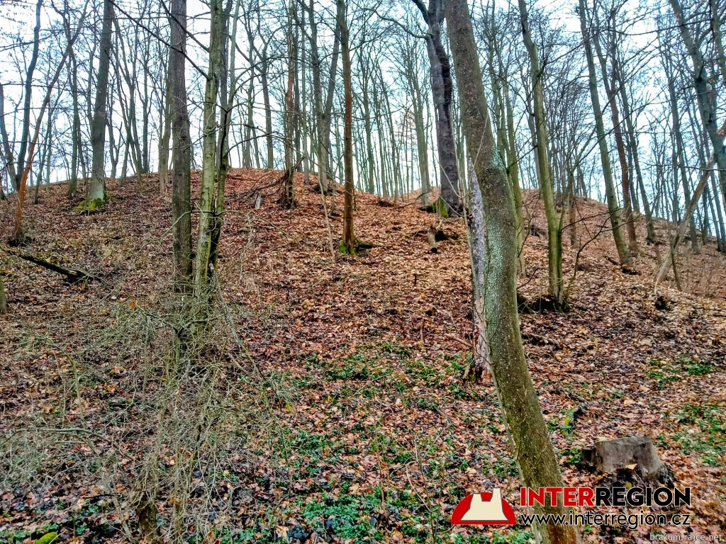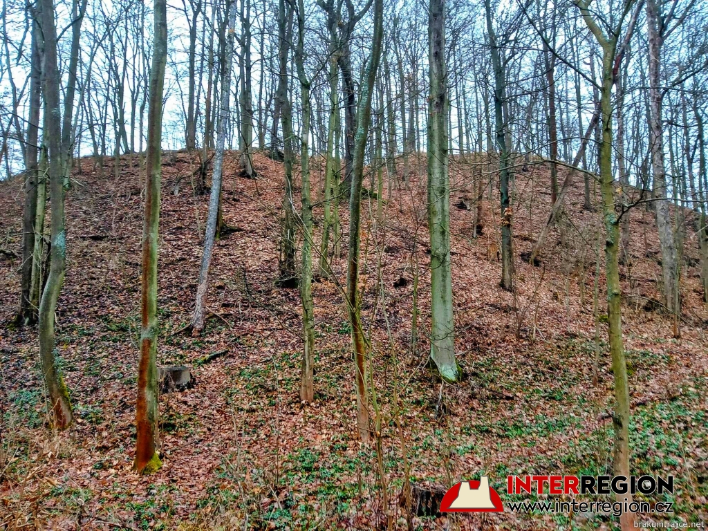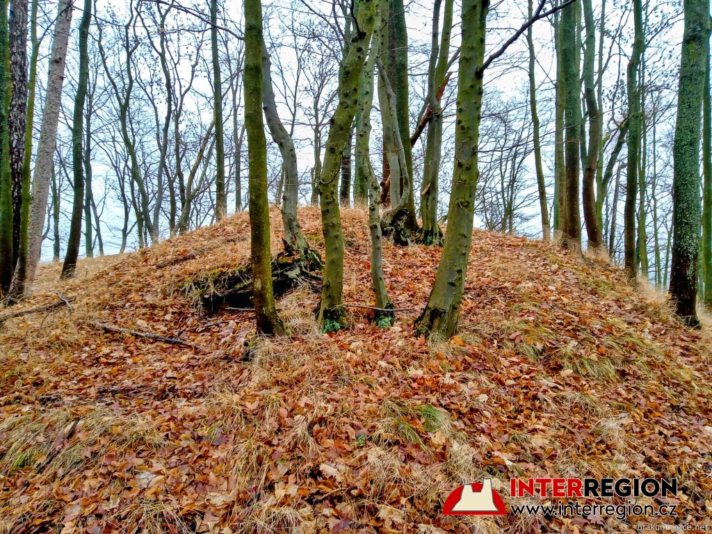 Hrad Pihel - vlevo nižší plošina, vytvořená člověkem. Vpravo vrchol kopce (12/2025)